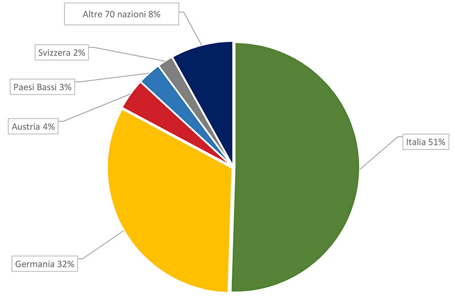 Per quanto riguarda la distribuzione in base ai paesi di provenienza si ha una prevalenza di utenti italiani. Al secondo posto la Germania, seguita a distanza dagli utenti austriaci (vedi dettagli).