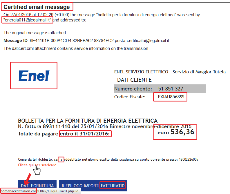 - Der Link in der E-Mail führt zu einer merkwürdigen Internetadresse. Dies lässt sich bei den meisten E-Mail-Programmen prüfen, indem man den Mauszeiger auf den Link zeigt (ohne darauf zu klicken). Dadurch wird in der Regel direkt über dem Mauszeiger oder unten links die Ziel-URL angezeigt (siehe Bild).