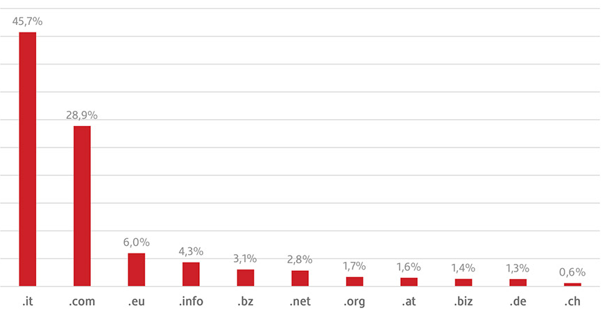 Die klare Nummer 1 ist die .it Domain. Beinahe jede zweite bei Limitis registrierte Domain endet auf .it oder auf einer geographischen Third-Level-Domain, wie etwa .bz.it.