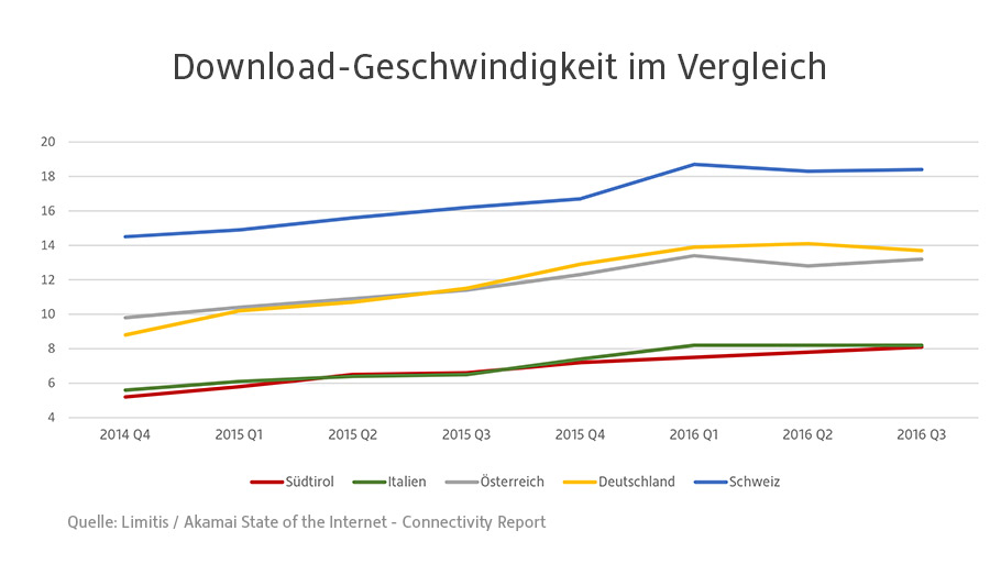 Blickt man auf die Situation der Nachbarländer, relativiert sich der Geschwindigkeitszuwachs der letzten beiden Jahre. Südtirol hinkt trotz millionenschwerer Investitionen deutlich hinterher (siehe Grafik oben).