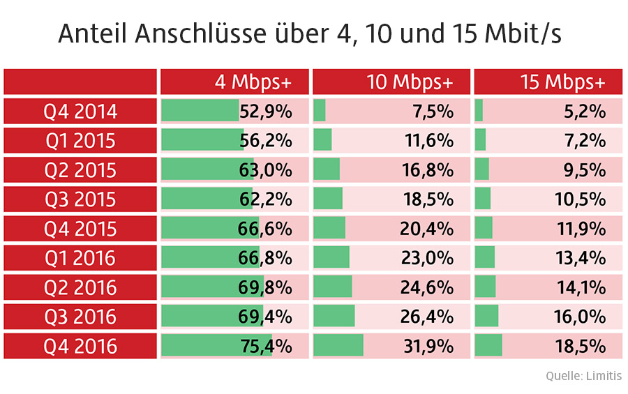 Besonders positiv stimmt die Tatsache, dass mit Ende 2016 immerhin drei von 4 Anschlüsse eine Geschwindigkeit von mindestens 4 Mbit/s aufweisen (siehe Grafik unten).