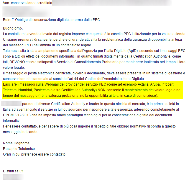 Aus aktuellem Anlass möchten wir unsere Kunden informieren, dass Pec-E-Mails – anders als in zurzeit kursierenden E-Mails behauptet wird – volle Rechtsgültigkeit besitzen.