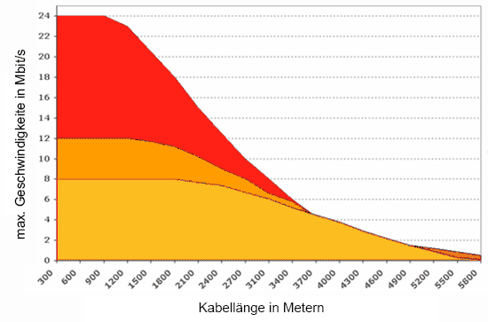 Bei einem ADSL-Anschluss wirken sich allerdings viele weitere Faktoren auf die Übertragungsgeschwindigkeiten aus. So spielt beispielsweise der Abstand vom Standort bis zur ADSL-Zentrale eine wichtige Rolle. Hier gilt grundsätzlich: je kürzer die Distanz bzw. je kürzer der Kabel, desto besser (siehe Grafik). Der Standort der Telecom-Zentralen kann auf dieser Seite nach Eingabe der Telefonnummer überprüft werden, so erhält man einen groben Anhaltspunkt über die Länge der Kabel. In größeren Ortschaften betreiben häufig neben der Telecom auch noch weitere Anbieter eigene ADSL-Zentralen bzw. Infrastrukturen, weshalb sich die erreichte Geschwindigkeit von Anbieter zu Anbieter stark unterscheiden kann. Hier empfiehlt es sich, ADSL-Anbieter gezielt auf den Standort der verwendeten Zentrale anzusprechen.