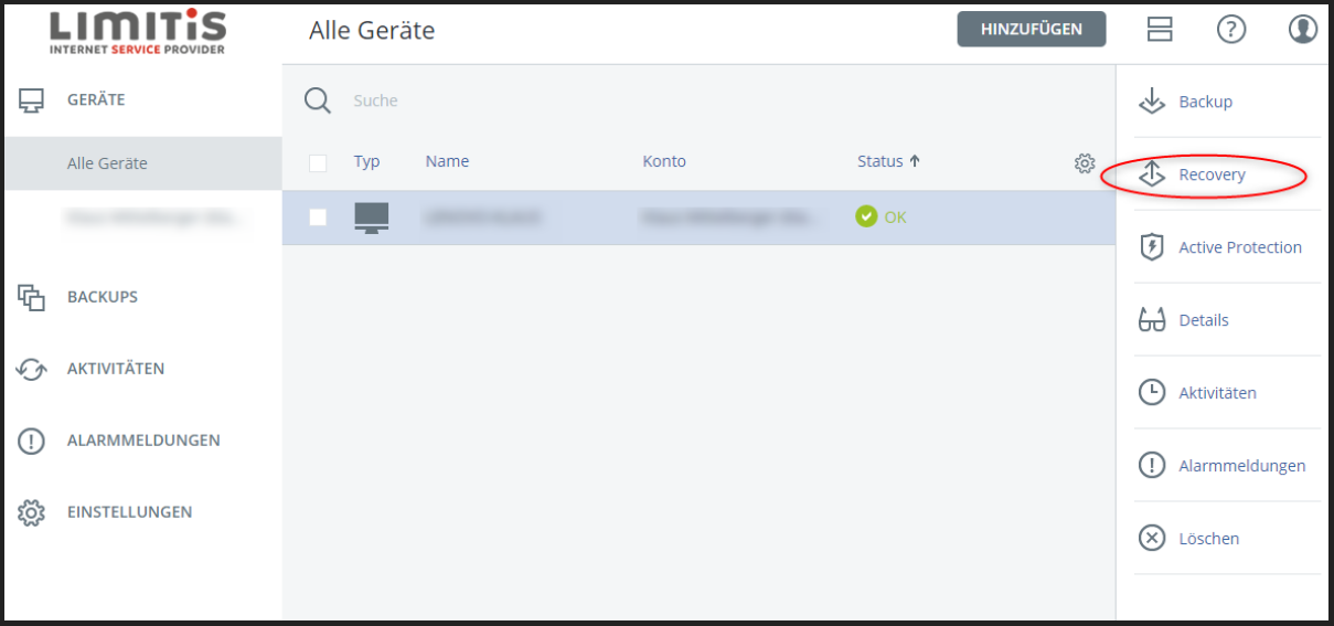 Um ein Backup wiederherzustellen, melden sie sich bei der Webkonsole mit ihren Zugangsdaten an und wählen Recovery für die Wiederherstellung: