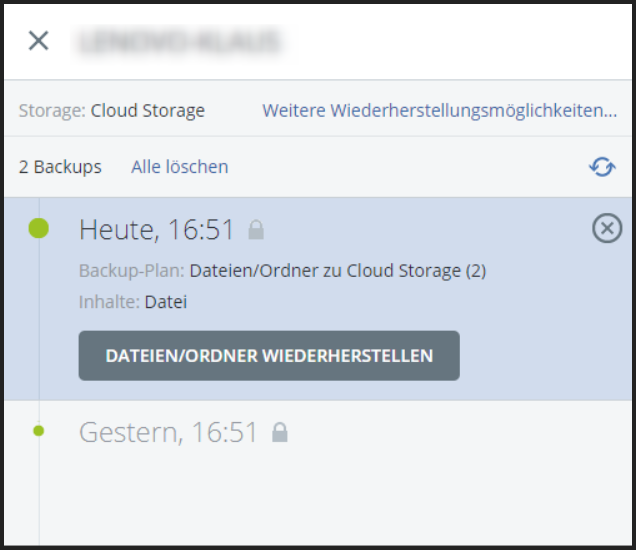 Je nachdem, welche Art von Backup sie erstellt haben, können sie nun wählen. Ich habe hier nur einige Dateien in einem Ordner gesichert. In der folgenden Übersicht sehen sie die zuletzt erstellten Backups: