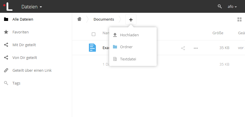 Dateien können entweder durch "Drag and drop" (Datei mit Mauszeiger in Ordner ziehen) oder durch Klick auf das Plus-Zeichen > Hochladen in die Cloud übertragen werden. Zum Löschen einer Datei klicken Sie auf das Dateisymbol und anschließend oben rechts auf Löschen.