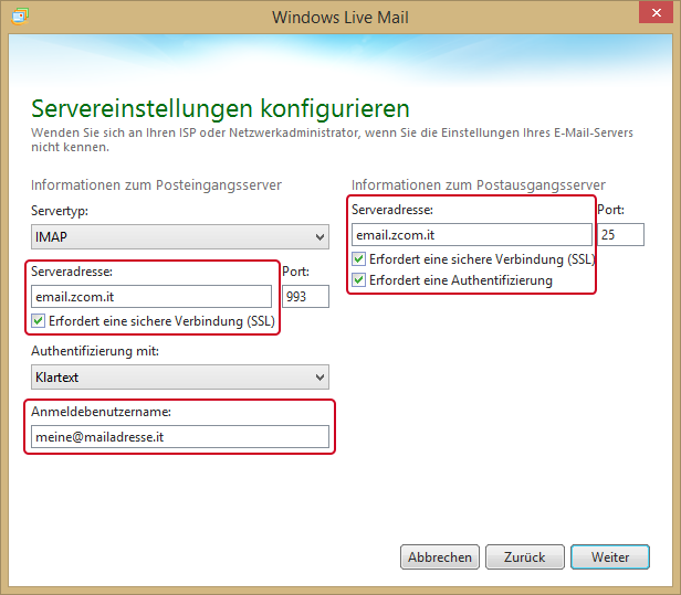 Die Serveradresse für Posteingangs- und Postausgangsserver lautet email.zcom.it. Es wird empfohlen, die beiden Felder "Erfordert eine sichere Verbindung (SSL)" zu aktivieren, worauf die Nummer im Feld Port automatisch an den richtigen Wert angepasst wird (993 bei IMAP und 995 bei POP3).