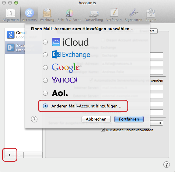 2. Klicken Sie links unten auf das + Zeichen und anschließend auf Anderen Mail-Account hinzufügen.