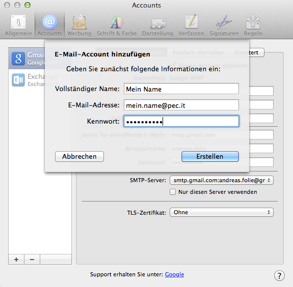 3. Geben Sie den Namen, der beim Empfänger angezeigt werden soll, sowie Ihre PEC-Adresse und Ihr Kennwort ein. Anschließend bestätigen Sie mit Erstellen. Es erscheint die Meldung Account muss manuell konfiguriert werden. Fahren Sie mit Weiter fort.