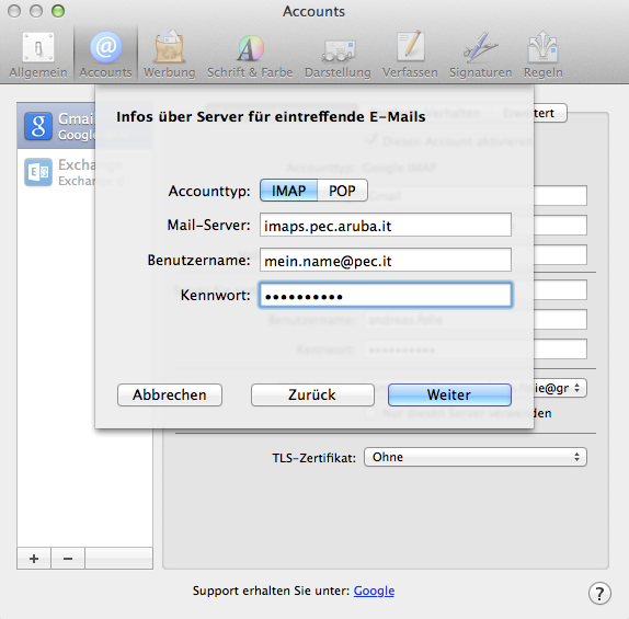 Anschließend muss der Name des entsprechenden Mail-Servers eingetragen werden: imaps.pec.aruba.it bei IMAP und pops.pec.aruba.it bei der Verwendung von POP. Nach Eingaben von Benutzernamen (Ihre vollständige PEC-Mail-Adresse) und Kennwort klicken Sie auf Weiter.
