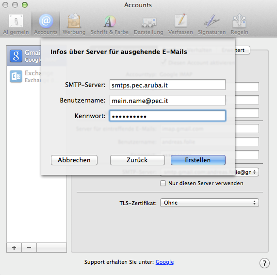 5. Nach erfolgreicher Überprüfung der bisherigen Angaben, müssen noch die Informationen über den Postausgangsserver angegeben werden. Geben Sie bei SMTP-Server smtps.pec.aruba.it, bei Benutzername Ihre PEC-Mail Adresse und bei Kennwort Ihr Passwort ein. Nach dem Klick auf Erstellen wird das PEC-Konto fertig eingerichtet.
