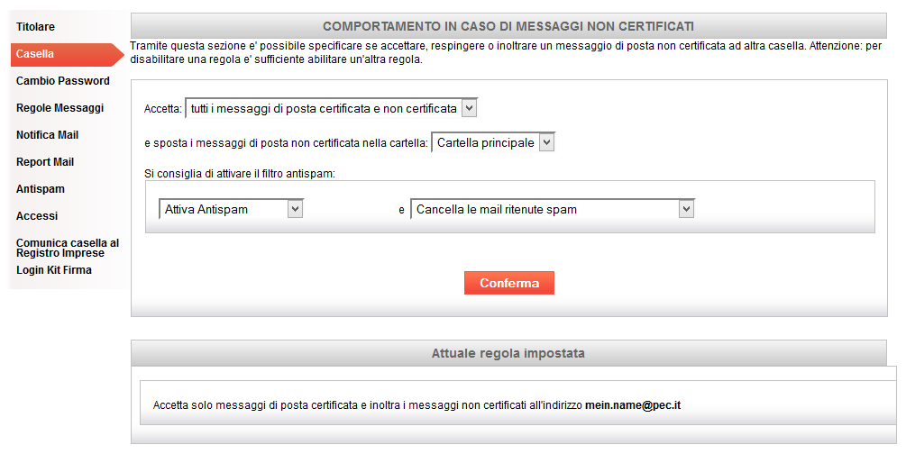 Der E-Mail-Emfpang von "normalen Postfächern" ist nicht möglich, es sei denn diese Option wird in den Einstellungen aktiviert. Hierfür öffnen Sie die Adresse https://gestionemail.pec.it und loggen sich mit Ihren Zugangsdaten ein. Unter Casella lässt sich anschließend festlegen, ob nicht zertifizierte Nachrichten akzeptiert werden und ob diese im PEC-Postfach gespeichert oder an eine andere Adresse weitergeleitet werden sollen.