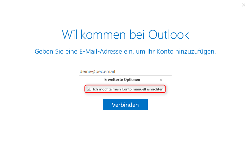 2. Geben Sie hier Ihre E-Mail-Adresse ein und wählen unter "Erweiterte Optionen" "Ich möchte mein Konto manuell einrichten". Klicken Sie anschließend auf "Verbinden".
