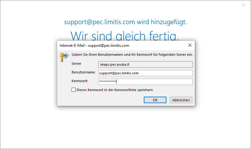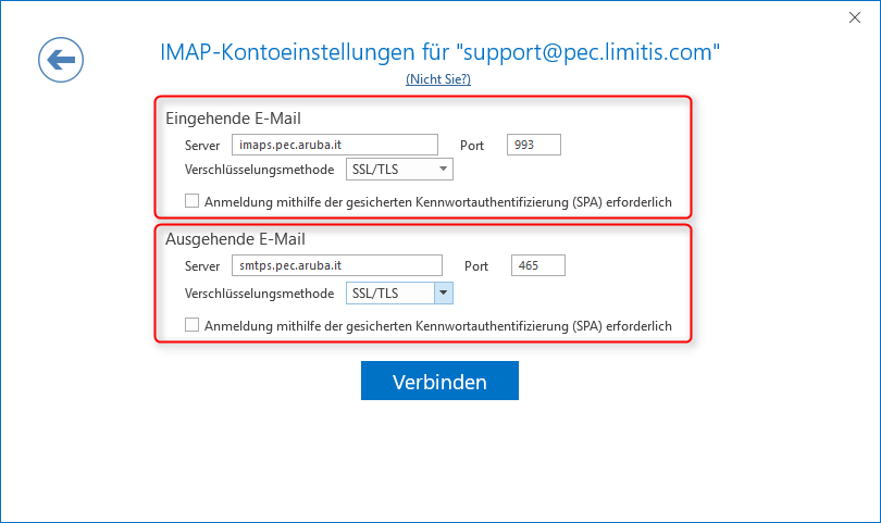 Bei jeder anderen PEC-Adresse tragen Sie wie im Bild bei "Eingehende E-Mails" im Feld Server "imaps.pec.aruba.it" ein und wählen die Verschlüsselungsmethode "SSL/TLS" aus.